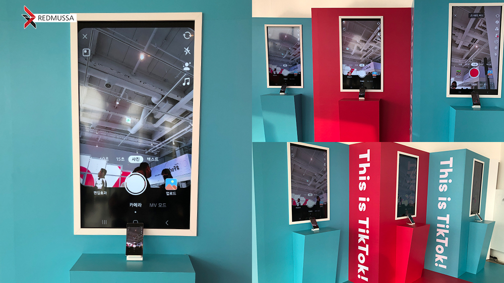 3대의 틱톡 필터 체험 공간에는 DID 모니터와 안드로이드폰으로 미러링을 이용한 틱톡 카메라 필터 촬영 키오스크를 세팅하여 흥미와 다채로움을 경험할 수 있는 연출을 하였습니다.