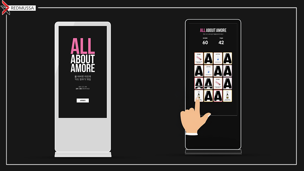 레드무싸에서는 카드를 뒤집어서 같은 제품의 이미지를 찾아 매칭하는 카드 맞추기 키오스크 프로그램을 개발 및 설치하였습니다