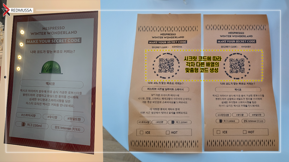 이 프로그램은 개인마다 각자 다른 시크릿 코드를 생성하고. 생성된 코드에 따라 다른 종류의 커피들을 매칭하여 단순히 커피를 주문하는 것이 아니라 자신만의 맞춤형 커피를 찾는 재미를 제공함으로써 특별한 경험을 제공하였습니다.