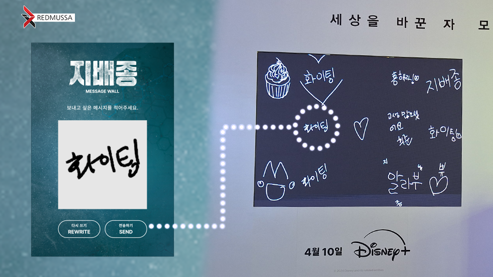 레드무싸는 메시지월을 통해 배우 또는 드라마를 향한 응원 메시지를 전달해 주는 프로그램을 설치 및 개발하였습니다.