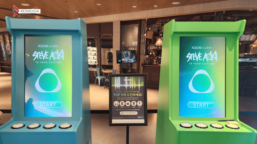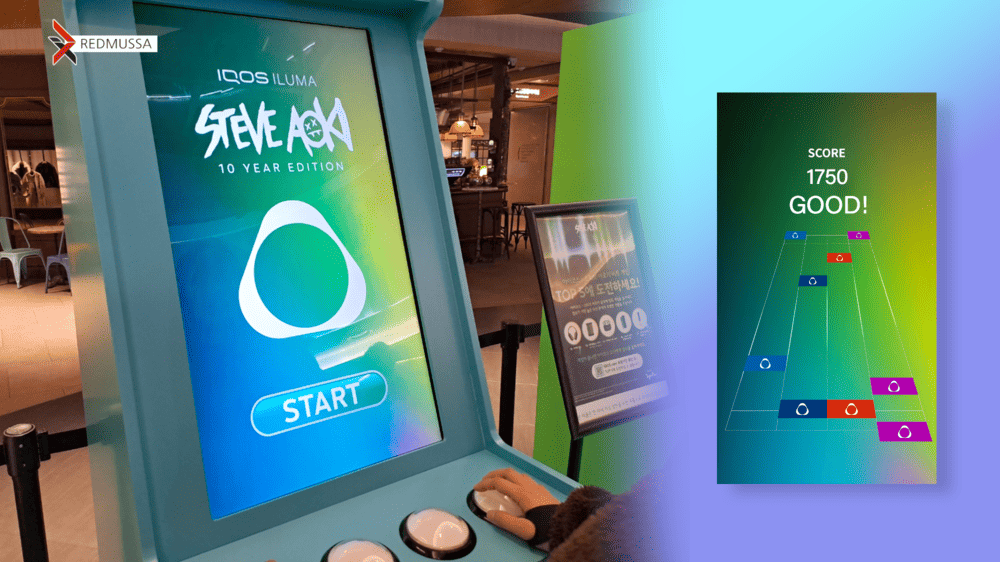 아이코스의 x 일루마 컬러를 적용한 하드웨어와 함께 역동적인 리듬 게임 키오스크는