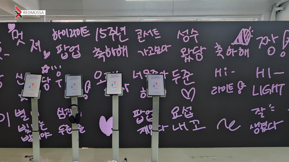 레드무싸에서 개발, 설치한 메세지월 프로그램을 통해 팝업 현장을 찾은 팬들에게